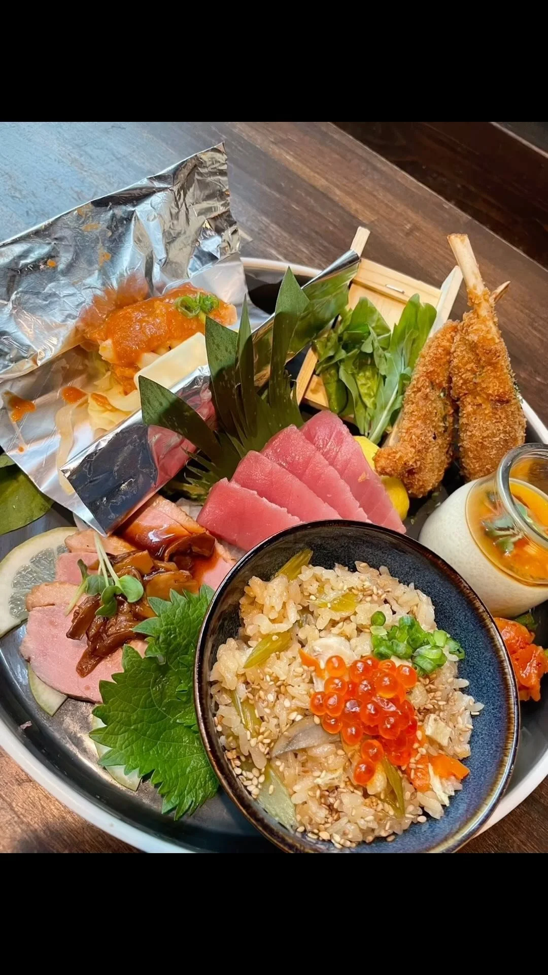 SLICED SASHIMI, JAPANESE PICKLES, CUCUMBER, HOUSE MADE MISO AIOLI SEARED TOPPED WITH SESAME SOY DRESSING, IKURA, TOBIKO, CRUNCHY AND KAIWARE.