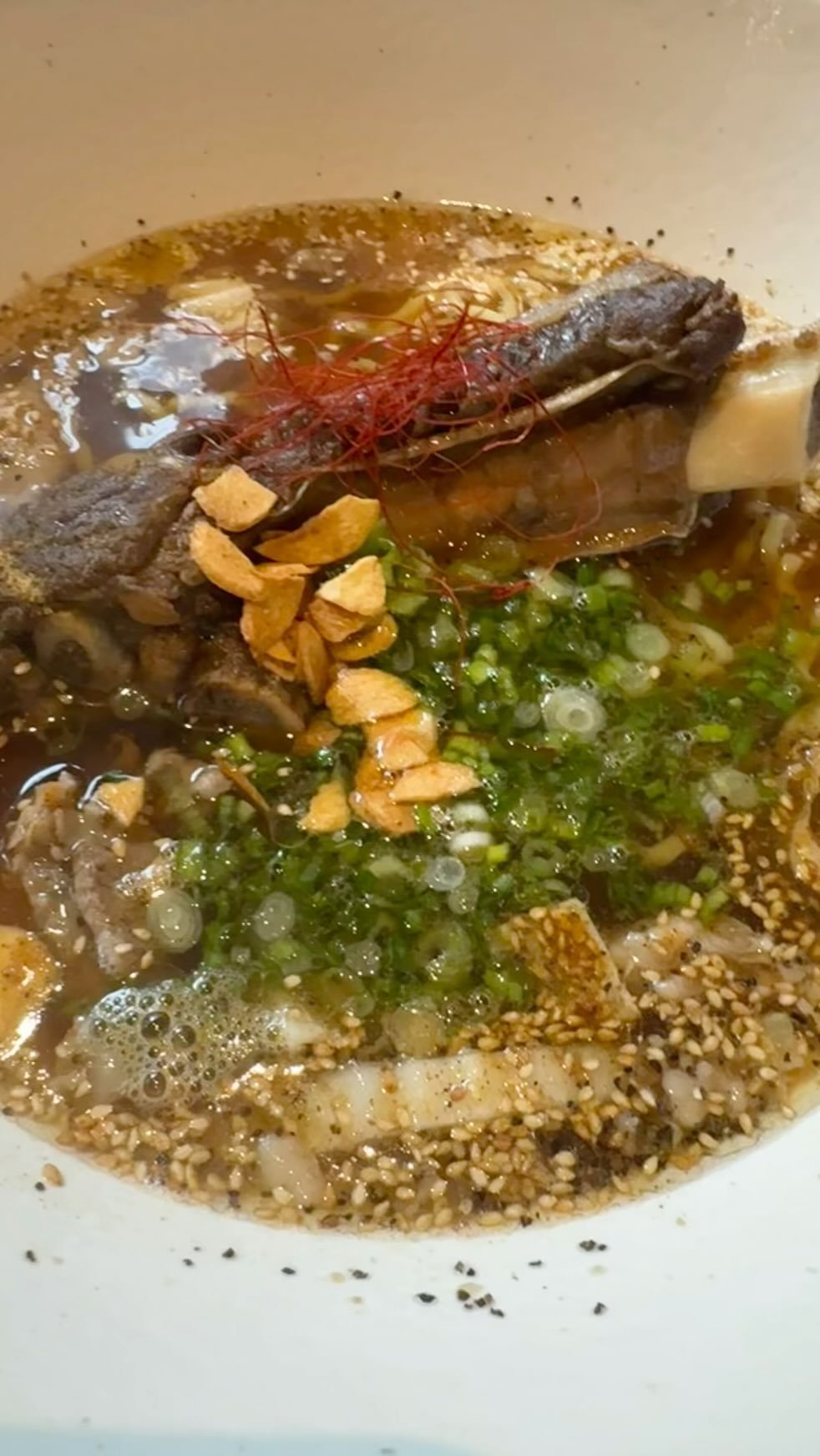 WAGYU BEEF TENDON, NAPA CABBAGE, TASTY WAGYU&PORK BROTH, HOUSE BLENDED SOY, RAMEN NOODLE, S.G. SPICY MISO MARINATED CHINESE CHIVES, GARLIC FLAKES, MINCED ONON AND DRIED CHILI.