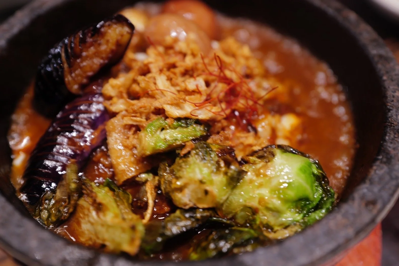 A rich Japanese-style curry infused with Wagyu beef, crushed tomato, caramelized onion, garam masala, ginger, garlic, house-blended spices, honey, chicken broth, and a touch of cream. Served with ra-yu and rice. Contains almonds.