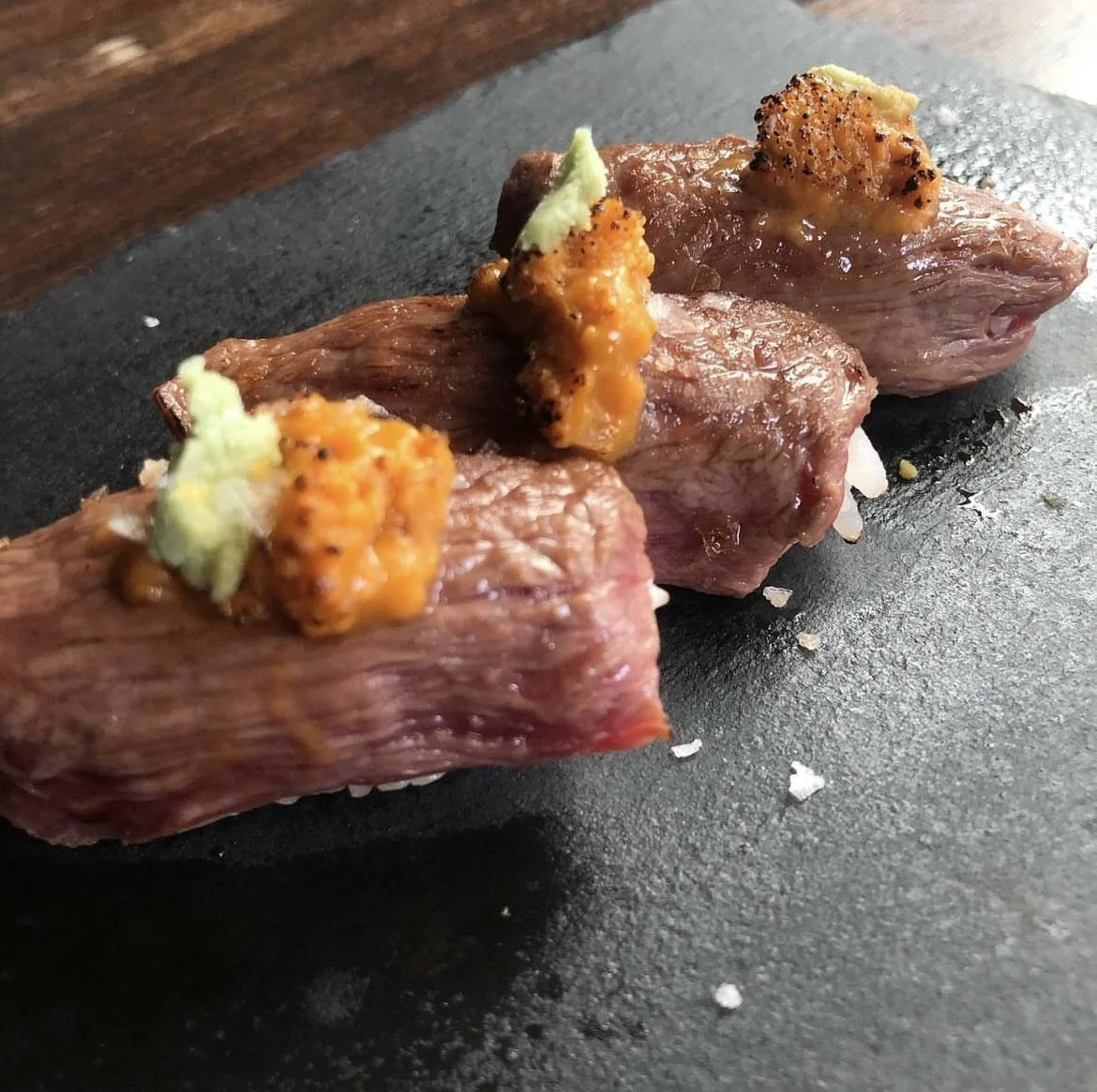 Seared Wagyu zabuton nigiri, topped with uni, soy, flake salt, and wasabi.